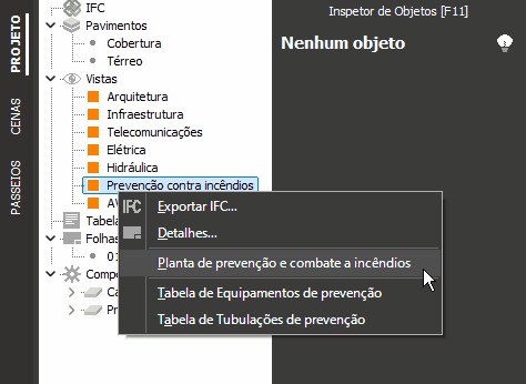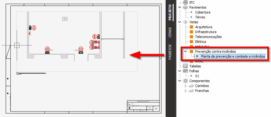 - Clique sobre a "Planta de prevenção e combate a incêndios" e mantendo o botão do mouse pressionado arraste para o projeto. A planta será gerada;