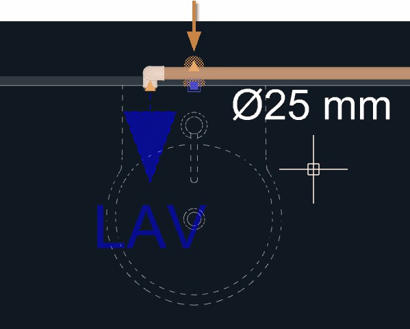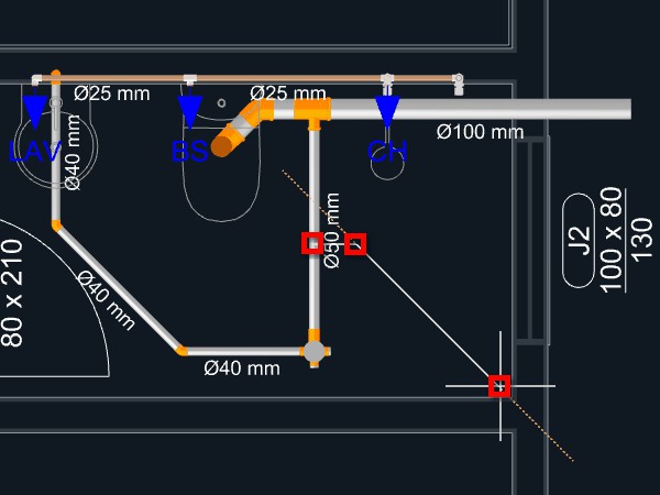 Clique sobre o triângulo laranja no ponto central do aparelho, onde se localiza a saída para o esgoto sanitário, para dar início ao lançamento da tubulação;